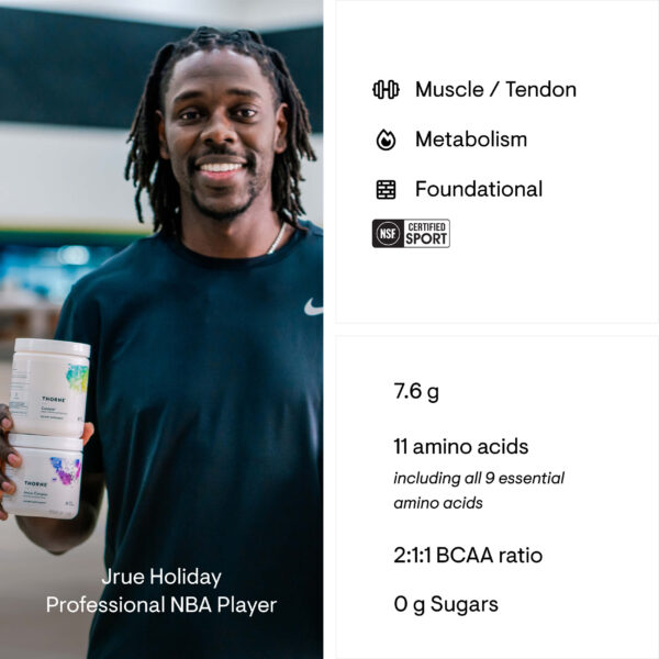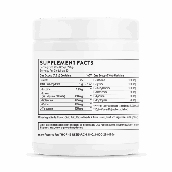 Thorne’s Amino Complex is a comprehensive blend of EAAs, which is high in branched-chain amino acids (BCAAs) – a group of amino acids that promote the growth of lean muscle mass and enhance muscle strength.*