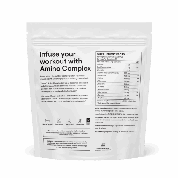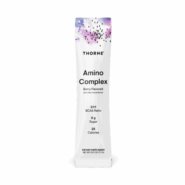Thorne’s Amino Complex is a comprehensive blend of EAAs, which is high in branched-chain amino acids (BCAAs) – a group of amino acids that promote the growth of lean muscle mass and enhance muscle strength.*