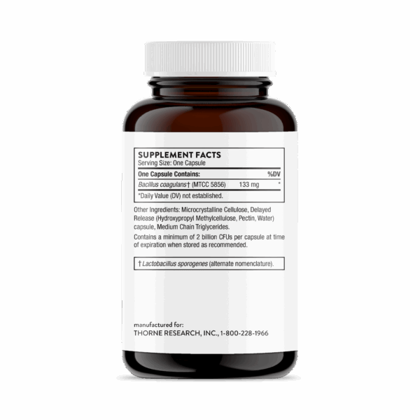 The intestinal tract contains trillions of bacteria that, when a person is healthy, coexist with us in a beneficial, symbiotic relationship. The beneficial bacteria help digest food, produce vitamins, regulate the metabolism, and facilitate a normal immune response.* Probiotic bacteria promote a healthy intestinal environment by producing lactic acid and by secreting fatty acids that are helpful to the growth of other beneficial microorganisms.* Bacillus coagulans (also known as Lactobacillus sporogenes) is a lactic acid-producing bacteria that is unique in probiotic supplementation.* While this beneficial bacteria is dormant in the bottle, it reverts to a growing bacteria in the intestines.* As a result, it resists being killed by stomach acid; in contrast, many Lactobacillus probiotics lose much of their potency before use and do not survive their transit through the stomach.*