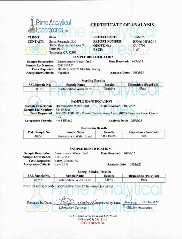 Bacteriostatic water, USP, isn’t your average H2O; it’s a sterile water solution with a small amount of 0.9%- 1.1% benzyl alcohol, acting as a bacteriostatic agent. This specialized composition makes it a go-to choice for diluting or dissolving medications for various types of injections. Its ability to halt bacterial growth ensures the solution remains sterile over multiple uses, distinguishing it from other water solutions in medical and research settings.