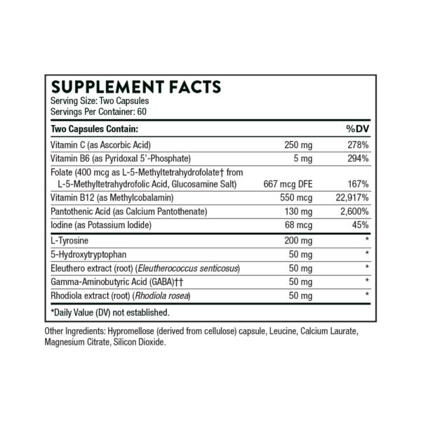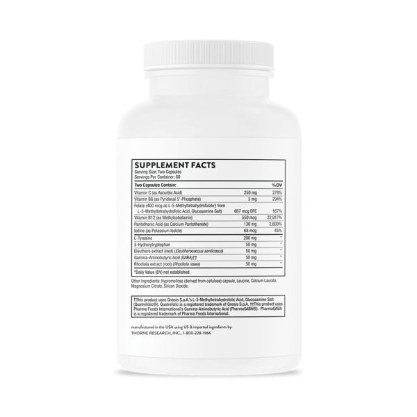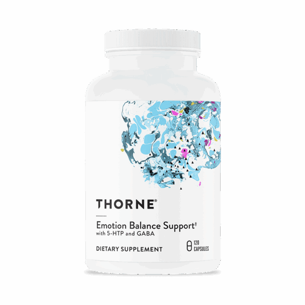 Thorne’s Emotion Balance Support is safe and effective for mood enhancement and stress management. It combines several well-known neurotransmitter-supportive nutrients, including L-tyrosine, 5-HTP, and GABA with two adrenal-supportive botanicals – Rhodiola and Eleutherococcus (a well-known adaptogen that provides general adrenal support. Emotion Balance Support includes the active forms of folate (5MTHF) and vitamin B12 (methylcobalamin) to support healthy neurological function and mood.*