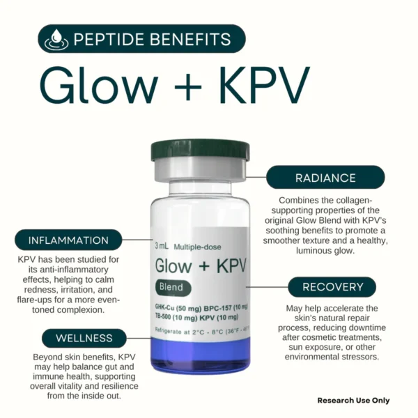Glow + KPV Blend “KLOW”— a peptide formula featuring GHK-Cu, BPC-157, TB-500, and KPV. This combination is commonly studied for its potential roles in tissue biology, antimicrobial and cosmetic science.
