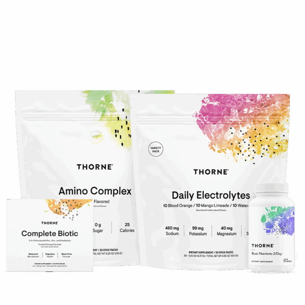 Thorne’s GLP-1 Support Stack includes a 30-day supply of four carefully selected nutritional supplements to support individuals engaged in weight-loss programs – those taking GLP-1s in particular.