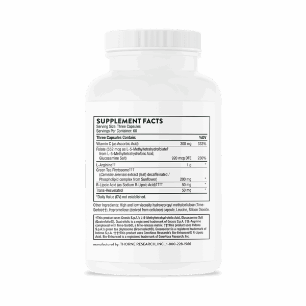Thorne’s L-Arginine Plus combines L-arginine with our Time-Sorb® complex to help maintain an optimal levels of L-arginine over 24 hours with suggested use. The addition of nutrients and antioxidants to the L-Arginine Plus formula provides additional support for healthy aging. Nutrients and cofactors support the benefits of nitric oxide and help optimize normal blood flow and vascular health.*