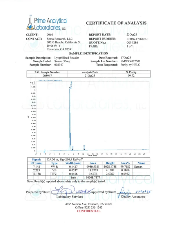 Semax Nasal Spray is a synthetic peptide derived from adrenocorticotropic hormone (ACTH), developed for investigational use in neurobiological and cognitive research.