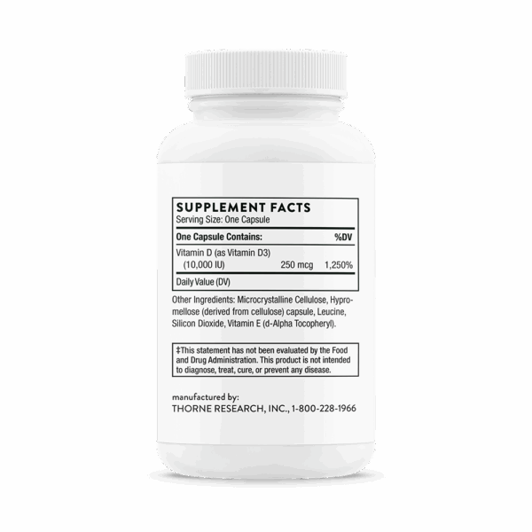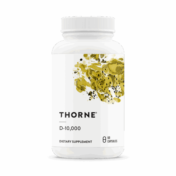 Thorne’s D-10,000 contains 10,000 IU of high-quality vitamin D3. Although it is well known that direct sunlight is a natural source of vitamin D, many individuals, especially the elderly, don’t get enough vitamin D from sunlight or from their diet. Be sure you get the vitamin D your body needs with Thorne’s easily absorbed Vitamin D-10,000.