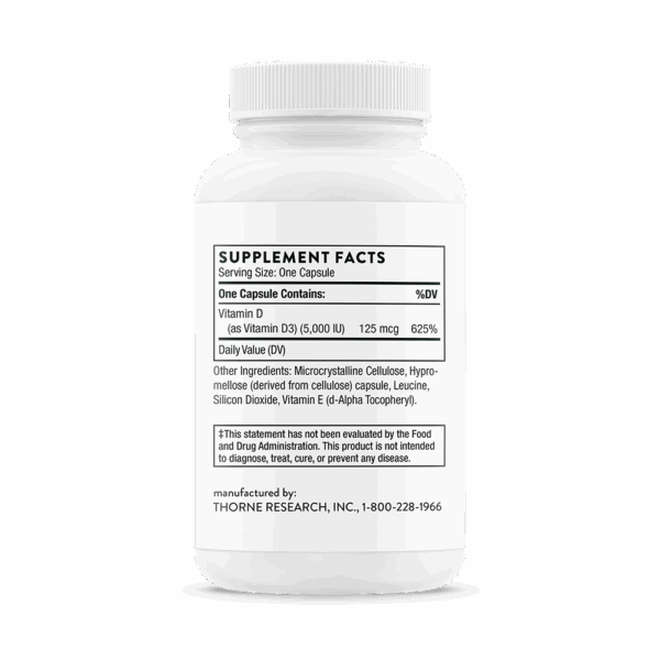 Thorne’s D-5,000 contains 5,000 IU of high-quality vitamin D3 and is NSF Certified for Sport®. Although it is well known that direct sunlight is a natural source of vitamin D, many individuals, especially the elderly, don’t get enough vitamin D from sunlight or from their diet. Be sure you get the vitamin D your body needs with Thorne’s easily absorbed Vitamin D-5,000.