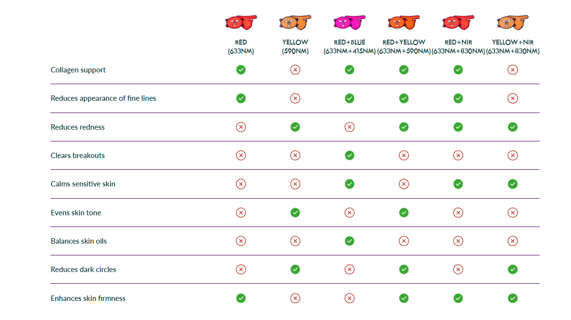 - Yellow light (590nm) reduces redness and helps sensitive skin feel more comfortable. It also helps your skin repair itself naturally.